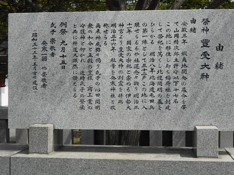 祭神の豊受大神は伊勢神宮の外宮の神様で食べ物・農耕の神です。