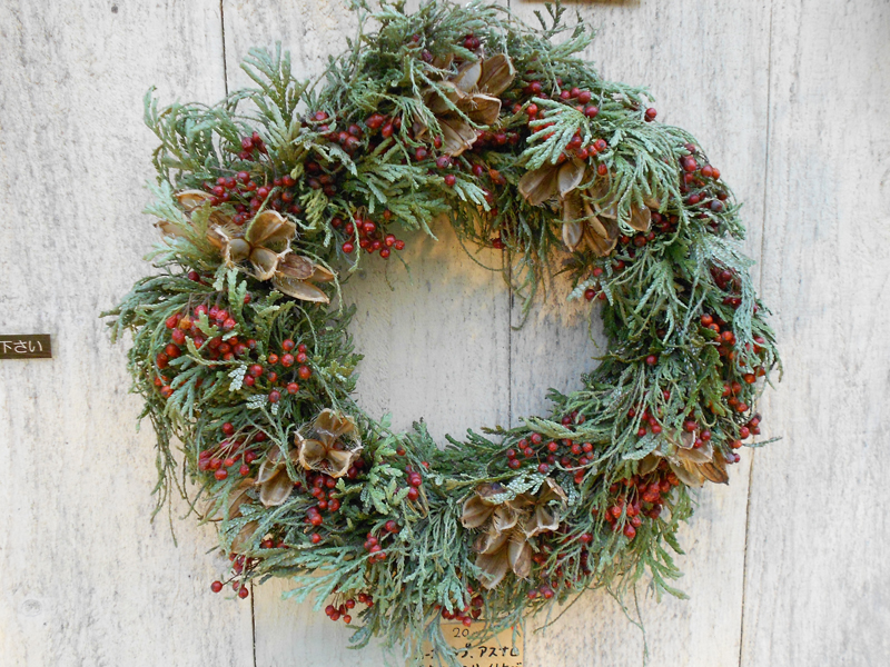 ハーブコーディネーター狩野亜砂乃さんによるリース等の作品の展示で、クリスマス気分をひと足早くあじわってきました。