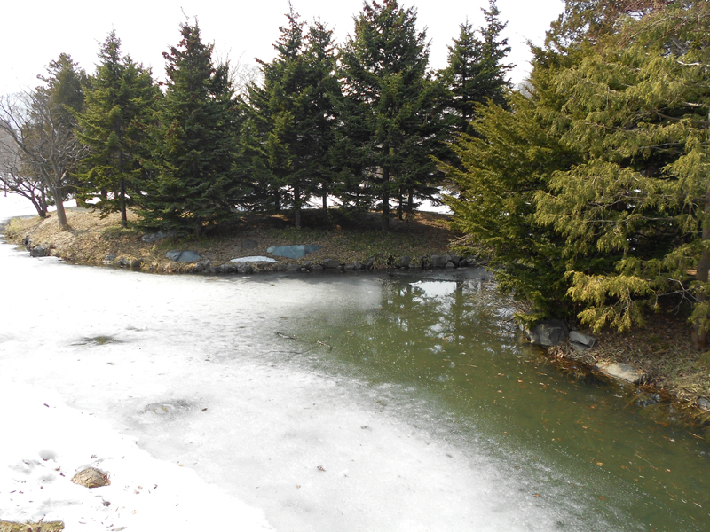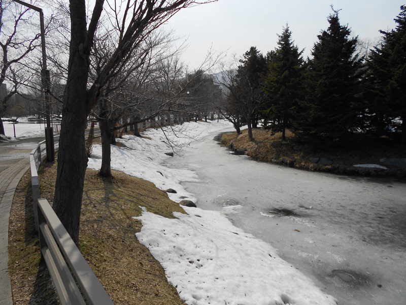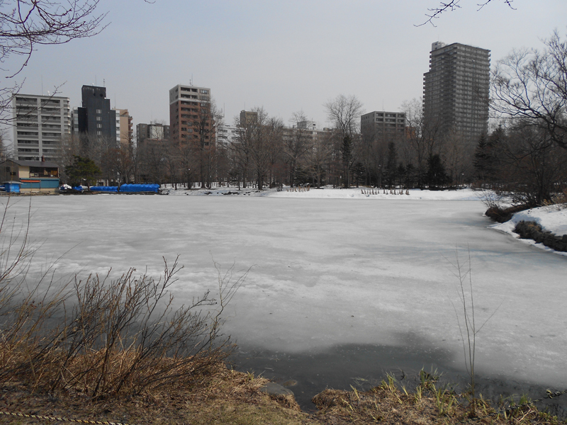 札幌の市街には雪はもう無く春なのですが、中島公園の菖蒲池はまだ氷で覆われていてまだ冬を感じさせられました。