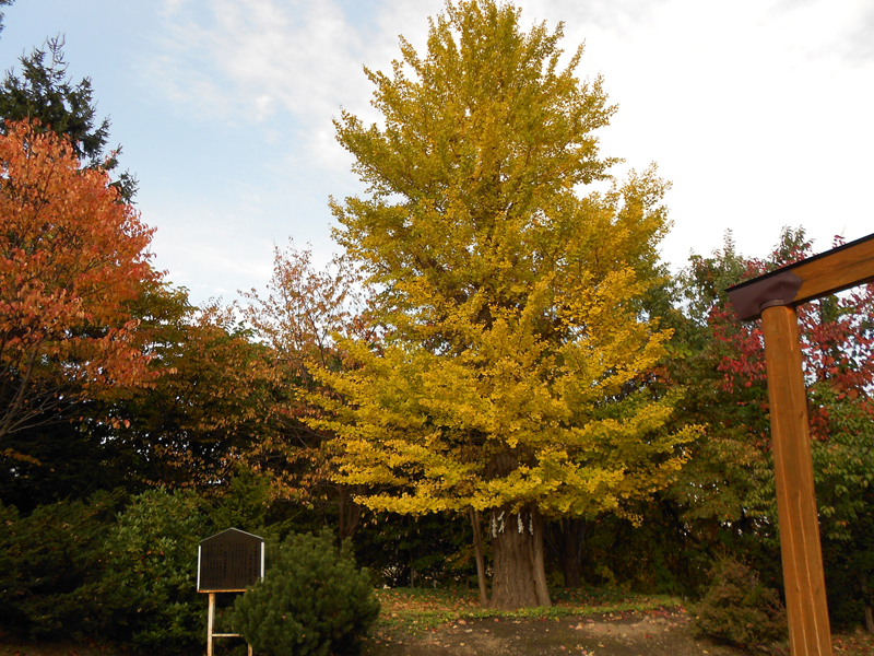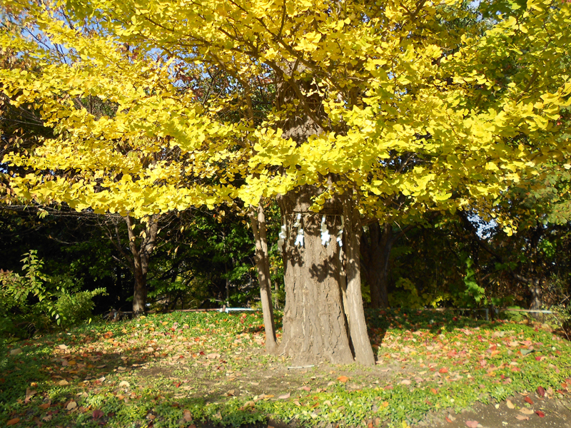 上手稲神社の御神木のイチョウの木です。少し色づきはじめました。(2017年10月16日、場所:上手稲神社、撮影:福田)