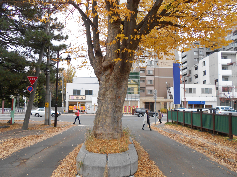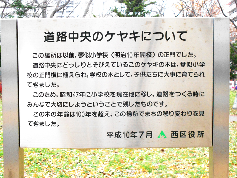 この道路中央のケヤキは、移転前の琴似小学校に植えられていたもので、樹齢100年を超えています。(2017年11月10日、場所:札幌市西区琴似2条7丁目2-1、撮影:福田)