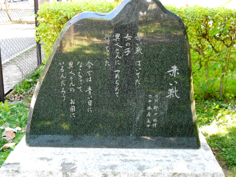 また童謡「赤い靴」歌碑は赤い靴の女の子のモデルとされる佐野きみの母親が後に札幌市の山鼻地区に移り、隣人の野口雨情に娘の「きみ」は宣教師に連れられて渡米したという話をし、それが童謡「赤い靴」を生むきっかけとなったそうです。